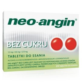 Neo-angin bez cukru - tabletki od bólu gardła działające zapobiegawczo i leczniczo w schorzeniach jamy ustnej i krtani, takich jak: nieżytowe zapalenie gardła, zapalenie migdałków, chrypka, przeziębienie. Zawarte w preparacie składniki hamują rozwój zarazków chorobotwórczych na błonie śluzowej jamy ustnej i gardła oraz działają miejscowo znieczulająco.