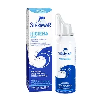 Działanie: STERIMAR przywraca naturalną wilgotność śluzówek nosa, uwalnia nos od wydzielin, ułatwia codzienną higienę nosa. Woda morska, podstawowy składnik preparatu STERIMAR pobierana jest z głębokich warstw morza, oddalonych ponad 30 km od brzegu, pozbawiona zanieczyszczeń niesionych przez wody przybrzeżne, sterylizowana i doprowadzona do roztworu izotonicznego.