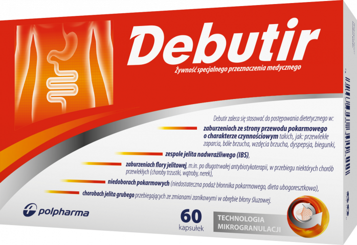 Debutir to dietetyczny środek spożywczy specjalnego przeznaczenia medycznego, którego zadaniem jest wspieranie pracy jelit, zwłaszcza jelita grubego. Preparat występuje w formie kapsułek zawierających mikrogranulowany maślan sodu — stabilną i odporną formę soli kwasu masłowego. Dzięki zastosowaniu technologii mikrogranulacji, substancja aktywna uwalnia się dopiero w jelicie grubym, czyli w miejscu, w którym kwas masłowy naturalnie pełni kluczową rolę w utrzymaniu zdrowia błony śluzowej.