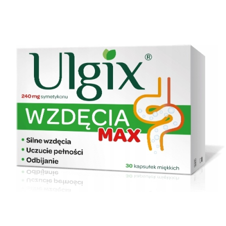 Ulgix Wzdęcia Max to wyrób medyczny przeznaczony do stosowania u osób dorosłych w celu łagodzenia dolegliwości związanych z nagromadzeniem gazów w przewodzie pokarmowym. Każda kapsułka zawiera 240 mg symetykonu – substancji o silnym działaniu odpieniającym, która zmniejsza napięcie powierzchniowe pęcherzyków gazu, ułatwiając ich usuwanie z organizmu.