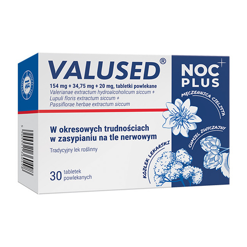 Valused Noc Plus to lek ziołowy dostępny bez recepty, przeznaczony dla dorosłych i młodzieży powyżej 12. roku życia. Zawiera kombinację naturalnych wyciągów roślinnych o działaniu uspokajającym i ułatwiającym zasypianie. Stosowany jest w okresowych trudnościach z zasypianiem oraz w stanach napięcia nerwowego wynikającego ze stresu.